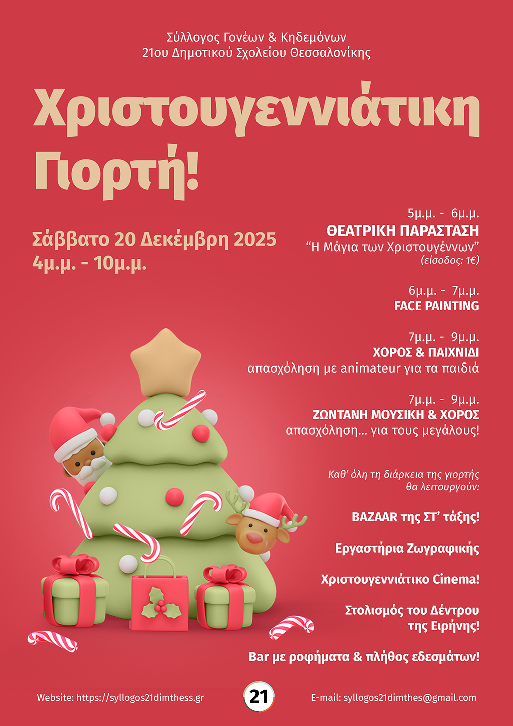 Καλωσορίσατε στην ιστοσελίδα του Συλλόγου γονέων και κηδεμόνων του 21ου δημοτικού σχολείου Θεσσαλονίκης! Εδώ θα βρείτε διάφορες πληροφορίες που αφορούν τον σύλλογο, τους σκοπούς και τη λειτουργία του αλλά και τα τρέχοντα ζητήματα που μας απασχολούν. Θα βρείτε πληροφορίες για τις δραστηριότητές μας ως ενεργοί γονείς και κυρίως πώς μπορούμε όλοι μας να συμμετέχουμε σ’ αυτήν την προσπάθεια βελτίωσης των συνθηκών της καθημερινότητας των παιδιών αλλά και της δικής μας, σε σχέση με το σχολικό περιβάλλον και την εκπαίδευση.